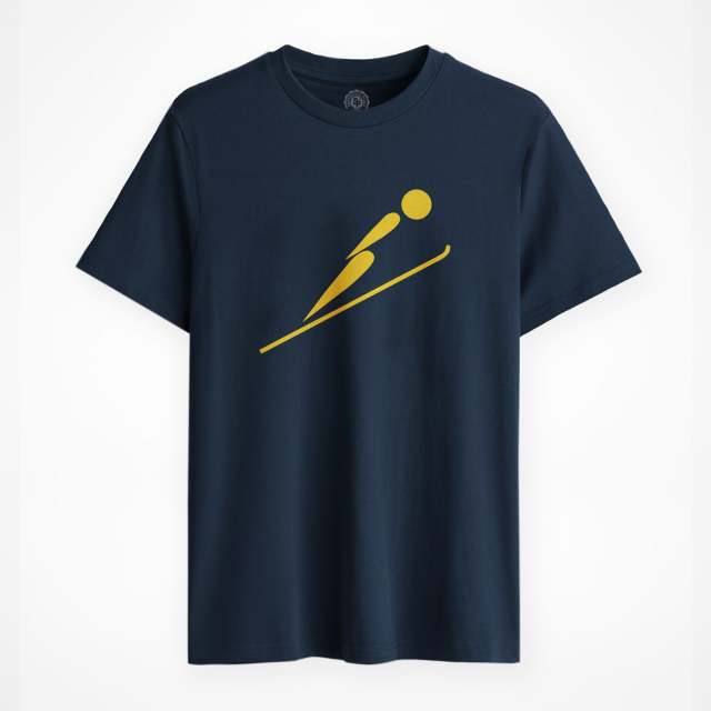 The design captures the classic flight position – total concentration and perfect balance. The yellow silhouette against the deep navy background creates a sense of weightlessness and elegance. Wear it as a reminder that the biggest leaps often offer the most beautiful views.